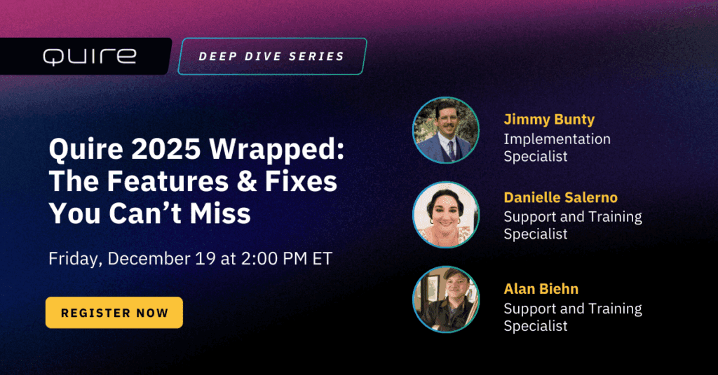 As we wrap up 2025, we’re bringing together the features, workflows, and tips that made the biggest impact for Quire users this year. Think of it as your Quire 2025 “wrapped” session—curated by the folks who live in the platform every day. Click here to register.